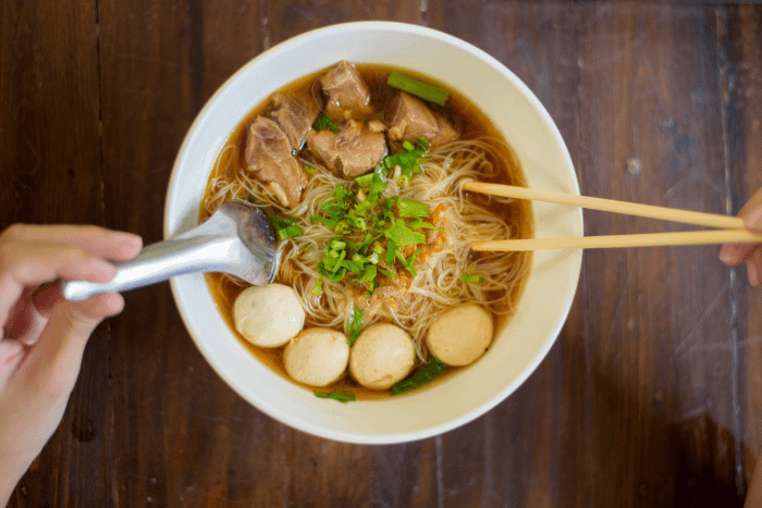 I classici noodles di riso, serviti solitamente in brodo. Quando li si ordina, si deve scegliere il tipo di spaghetti, il tipo di brodo – Tom Yum, Yentafo-o, Nam Tok o Nam Sai – e ciò che si vuole accompagnare – polpette, anatra, pollo, maiale, carne, pesce, frutti di mare.