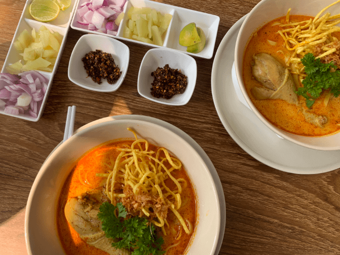 Un tipico piatto del nord della Thailandia, che include sia noodles all’uovo cotti sia fritti, serviti solitamente in un curry giallo con pollo o carne e verdure.