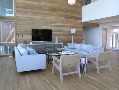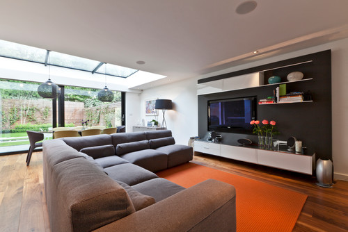 THAI. ผนังด้านหลังทีวีต้องเป็นแบบเรียบๆ และไม่เน้นความสนใจของผู้ที่อยู่ในห้องมากเกิน เพื่อหลีกเลี่ยงความขัดแย้งกับทีวีเมื่อเปิดเครื่อง: คุณสามารถเลือกรูปแบบงายๆใช้ตกแต่งผนังนี้ เช่นลายไม้ปาร์เก้เหมือนในภาพด้านล่าง ไม้ของผนังเขาพอดีกับสีของห้อง และดูคล้ายๆกับรูปแบบของพื้น