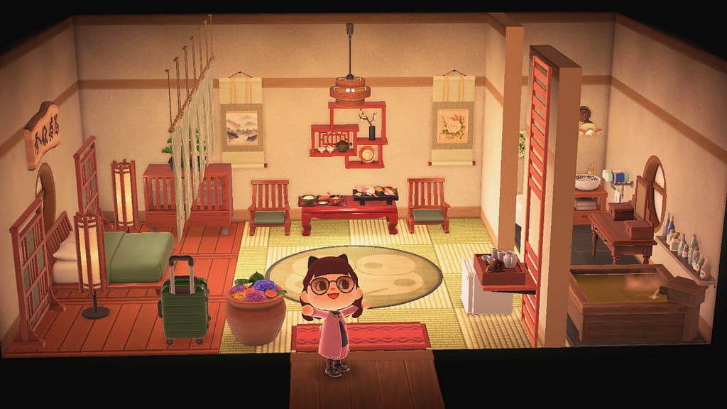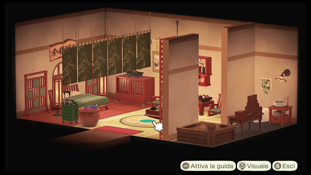 Come per le altre stanze, anche qui abbiamo il bagno sulla destra. Il resto della stanza è stato poi diviso in due sezioni: a sinistra c’è la zona notturna, separata tramite le tende giapponesi, mentre nella parte centrale c’è la zona giorno-relax, con tanto di minibar e poltroncine.