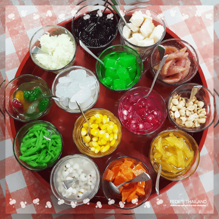 Ovviamente ci sono molte altre varianti che qui non sono presenti: DATTERI, altra frutta thailandese fresca o sciroppata come KANUN/JACK FRUIT, DURIAN, e altri legumi tropicali… dipende molto dalla gelateria o dalla bancarella che vi trovate davanti!
