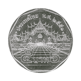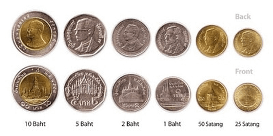 Per quanto riguarda le monete possiamo trovare ben 6 tagli, di cui due tipi di centesimi, che in Thailandia vengono chiamati “SATANG”. Ci sono i 25 satang (all’estrema destra nell’immagine precedente) e i 50 satang. Queste due monete sono di rame.