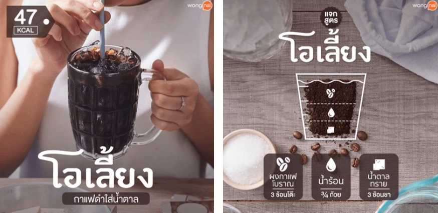 Oliang ( โอเลี้ยง ) invece si utilizza per indicare un caffè nero e freddo, ottenuto versando il caffè bollente in un bicchiere con ghiaccio. E si dice che siano stati i thailandesi ad “inventare” questo tipo di caffè; in nessun paese asiatico confinante esisteva un “caffè freddo”, ma solo la versione calda.