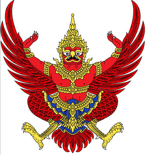 Emblema della Thailandia: la divinità Garuda (sì, il simbolo ufficiale della Thailandia è proprio un dio indiano: questo dovrebbe già far intuire come la mitologia indiana sia in realtà molto presente nella cultura thailandese, in particolare a come essa sia legata al buddismo), nome thailandese Phra Khrut Pha.