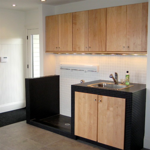 นอกจากนี้ ในห้องซักรีดของคุณ คุณสามารถมีเครื่องอบผ้า และพื้นที่ขนาดใหญ่กว่าอ่าง เพื่อล้างเครื่องมือขนาดกลาง หรือเพื่ออาบน้ำสุนัขของคุณ (ด้านล่างนี้ คุณสามารถเห็นสี่ไอเดียที่มีความสูงต่างกัน ขอให้จำไว้ว่า หากคุณต้องการสร้างพื้นที่ที่คล้ายกันในรูปนี้ที่มีความสูงสูงมากกว่าพื้น คุณอาจต้องใช้ชั้นวางของที่ถอดออกได้ เช่นในภาพที่สาม หรือบันไดเล็กๆ เช่นในรูปสุดท้าย เพื่อให้สุนัขของคุณสามารถเขาและออกด้วยตัวเอง!)