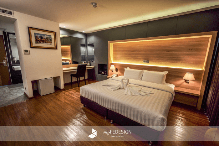 Ovviamente riuscire a trovare la stessa lampada o la stessa sedia inserita nel render spesso non è possibile, e in corso d’opera può essere necessario cambiare alcuni elementi per altri comunque sullo stesso stile – qui sotto, ad esempio, le luci laterali al letto erano molto costose e occorreva attendere diverse settimane prima di averle a disposizione, per cui si è scelto per un’opzione già disponibile in negozio per velocizzare la realizzazione della camera e la conseguente apertura dell’hotel stesso.