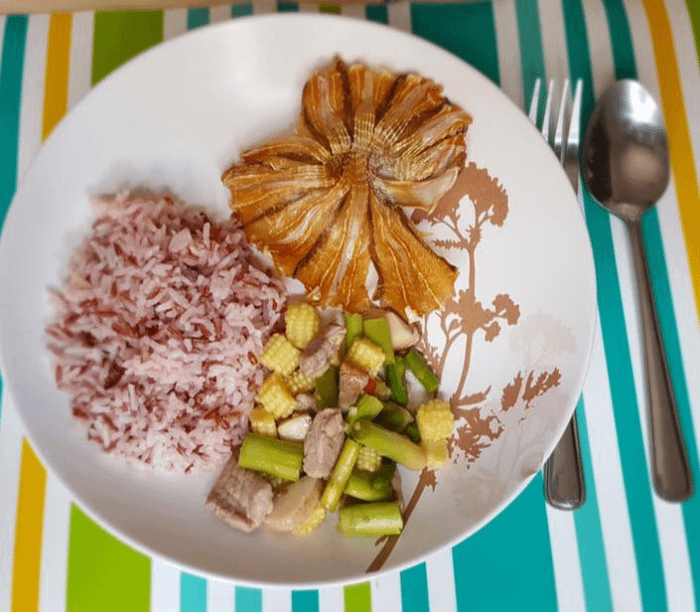 PAD PAK da accompagnare a riso in bianco (nella foto è stato cotto mescolandolo con del riso integrale) + bonus! mamma Ralita ha deciso di aggiungerci anche un pezzo di pesce fritto (non chiedetemi di che pesce si tratta perché ancora non l’ho scoperto! Ma vi posso assicurare che è buonissimo e croccante).
