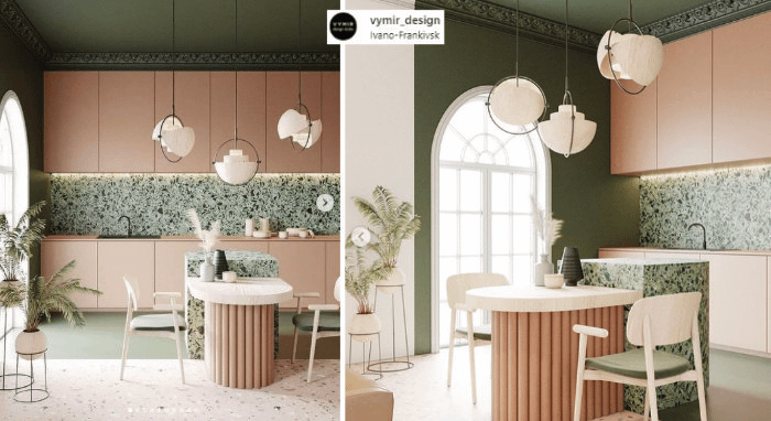 ENG. What impressed me about this kitchen are the use of the terrazzo stone and the colors. On the vymir_design Instagram profile we can see different corners of this room, whose dominant colors are two: pink and green, with some white decorative elements.