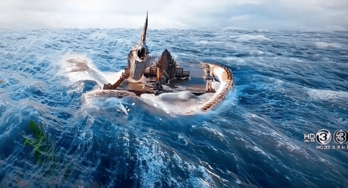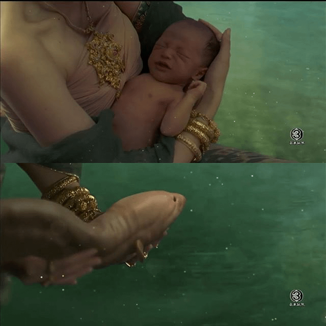 La causa di quell’ira è presto motivata: gli uomini uccisero il figlio di Jiao Mae Nakee, che ella “nascose” al padre e agli altri della sua specie trasformandolo in una specie di delfino/pesce/animale-non-ben-definito (vi lascio un’immagine presa dal telefilm) e lasciandolo libero in acqua.