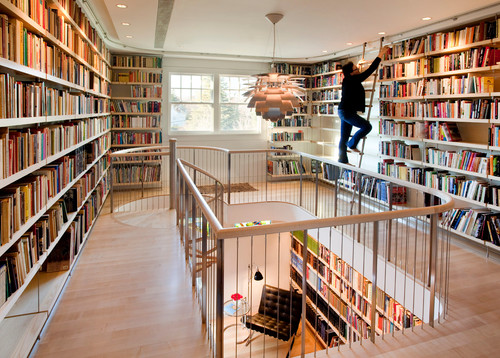 THAI. หากใครมีบ้านที่ใหญ่มากๆ สิ่งที่สมบูรณ์แบบที่สุดสำหรับเรา คือสร้างทั้งชั้นหนึ่ง ให้เป็นห้องสมุด เพื่อสร้างห้องสมุดในฝัน เช่นในภาพด้านบนนี้ ชั้นลอยในรูปเป็นพื้นที่เฉพาะหนังสือ โดยมีตู้หนังสื้อที่มีบันได เพื่อไปหยิบหนังสื้อที่ชั้นบนสุด มีใครบ้างที่ชอบห้องนี้ และอยากไปนั่งเล่นบ้างคะ?